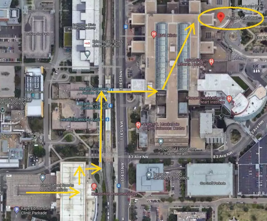 NOTE: Please ensure you allow additional time for parking regardless of where you decide to park. If you utilize the Kaye Clinic Parkade, we recommend allowing 15-20 minutes to park and walk to Bernard Snell Hall.